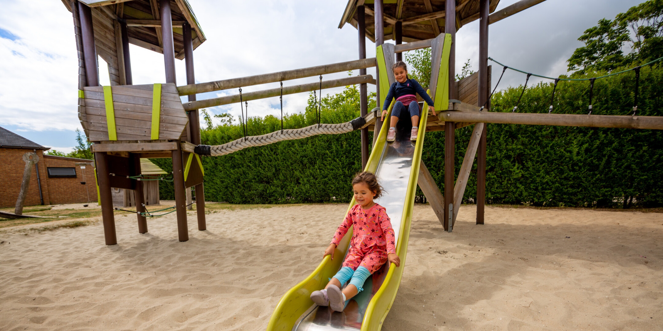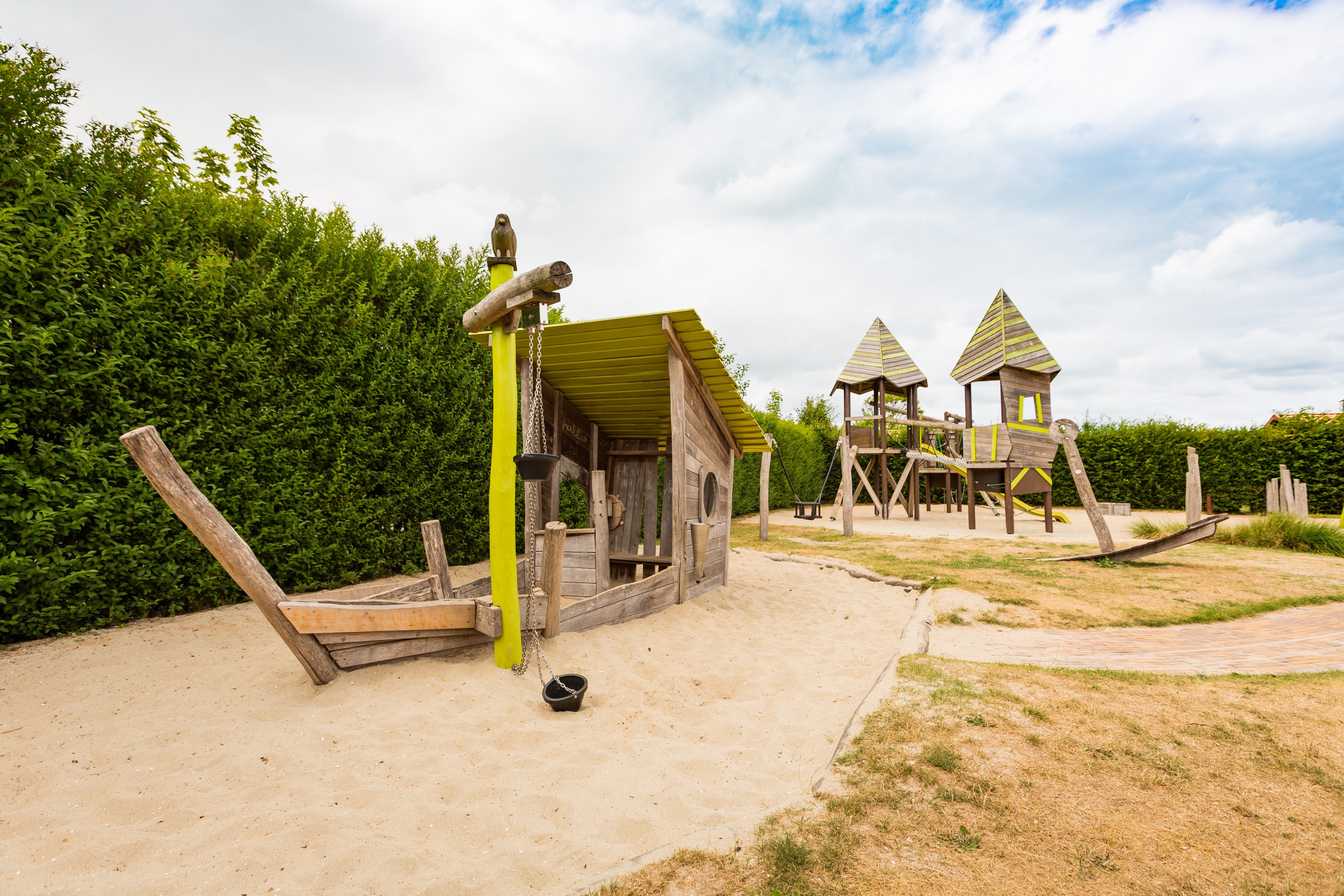At our campsite, we have a fun playground where you can play with your new friends. You can climb, swing and slide on the different playground pieces. You can also play hide and seek among the trees and bushes.